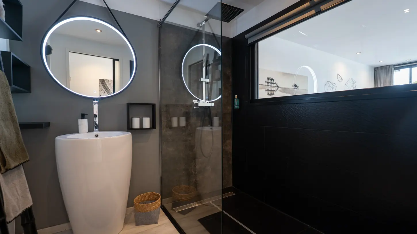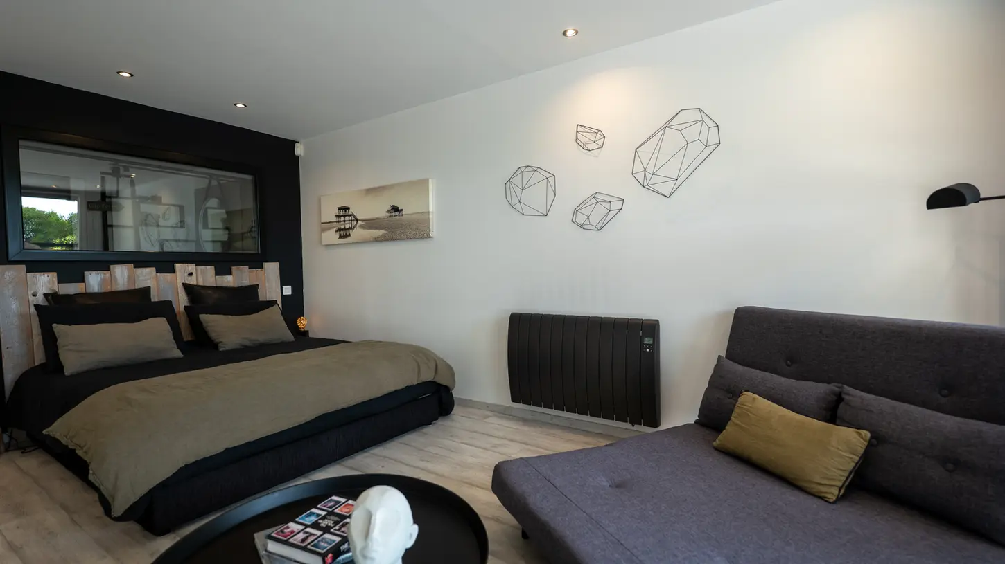 Un cocon lumineux avec vue directe sur la piscine, lit queen-size à mémoire de forme (160x200), douche à l’italienne, WC séparé. Un grand placard, une commode, et un canapé convertible pour 1 ou 2 personnes avec surmatelas confort. Ambiance douce et naturelle.